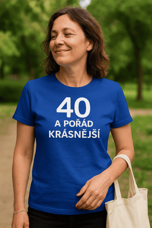 Čtyřicet a pořád krásnější? Přesně tak. 💙 Dámské tričko s nápisem „40 a pořád krásnější“ je malý módní manifest, že s věkem roste šarm, nadhled i sebejistota.