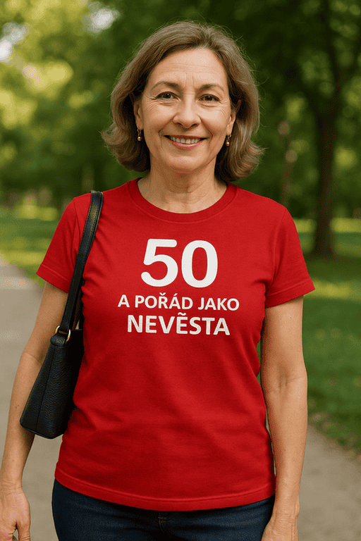 Je ti 50 a energie na rozdávání? 🔥 To si říká o tričko, které to řekne nahlas: „50 a pořád jako nevěsta“.