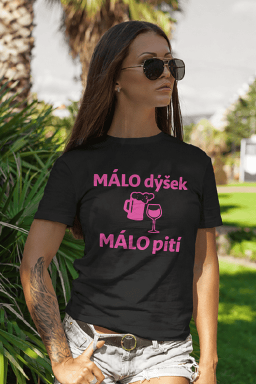 Když je rozpočet menší než žízeň, mluví za tebe nápis „Málo dýšek málo pití“. 🥂💸 Černé dámské tričko s výrazným potiskem pro královny baru a afterwork partičku.