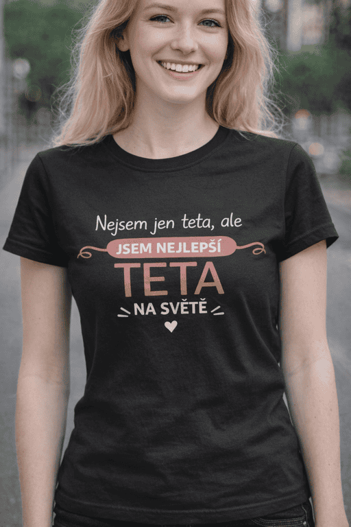 Nejsi jen tak obyčejná teta… ty jsi ta, na kterou se těší všichni! 😄 Tohle černé dámské tričko s nápisem „Nejsem jen teta, ale jsem nejlepší teta na světě“ a malým srdíčkem dá jasně najevo, kdo je v rodině královna zábavy. 💖