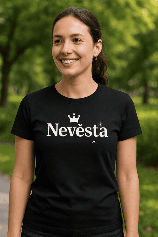 Když jsi nevěsta, velíš celé svatbě. 👑 Tričko s nápisem „Nevěsta“ s korunkou a hvězdičkami je dokonalé na rozlučku i svatební přípravy. ✨