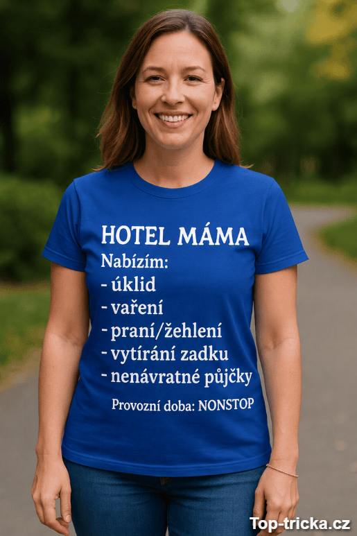 Hledáš vtipné tričko dárek, který řekne pravdu nahlas? „HOTEL MÁMA“ má otevřeno nonstop a účtuje se to… hlavně nervy 😄