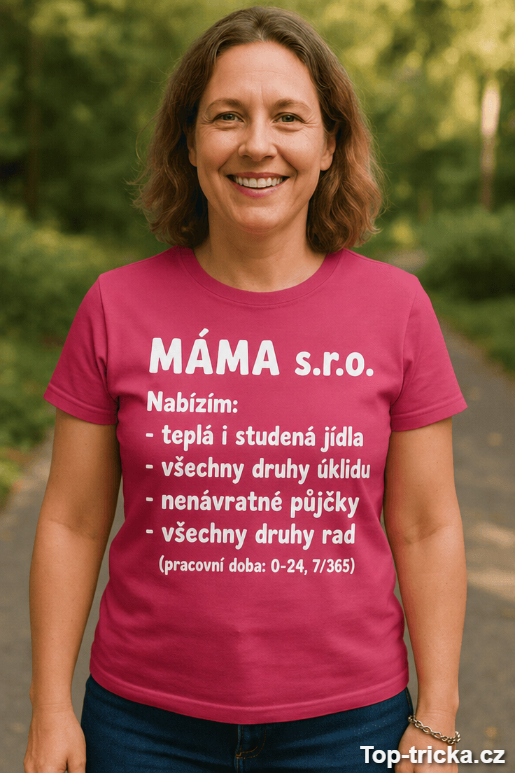 Tohle vtipné tričko máma dárek je pro mámy, které jedou v režimu 0–24 a ještě u toho stíhají rozdávat teplá i studená jídla, všechny druhy úklidu, nenávratné půjčky i životní rady. Nápis „MÁMA s.r.o.“ to shrne jednou větou – a pobaví hned na první pohled 😄