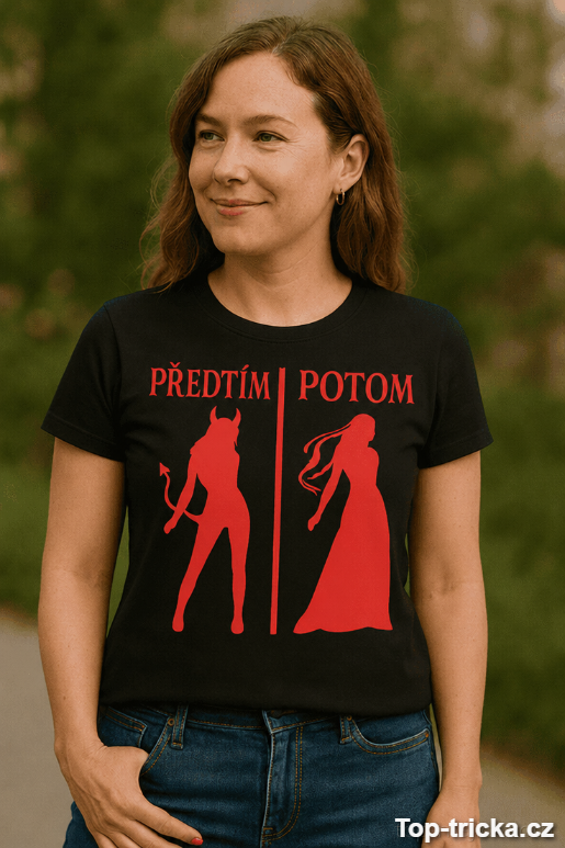 Vtipné tričko předtím potom je přesně ten typ humoru, který funguje všude: v práci, na srazu i na party. Dva jednoduché výrazy „PŘEDTÍM POTOM“ a najednou máš na sobě příběh, který si každý domyslí po svém.
