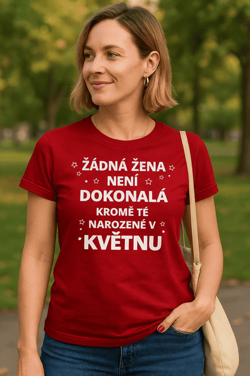 Trocha sebevědomí, špetka humoru a hvězdičky k tomu ⭐ Dámské tričko s nápisem „Žádná žena není dokonalá kromě té narozené v květnu“ je přesně ten kousek, který řekne vše za tebe.