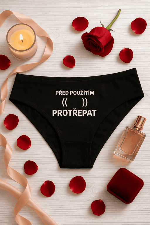 😏 Pravidlo zábavy je jasné: Před použitím ((protřepat))! Tyhle černé dámské kalhotky řeknou všechno ještě dřív, než se zhasne. Nápis rozbije rutinu, vyvolá smích a přidá jiskru – pro ženy, které umí míchat humor se sváděním.