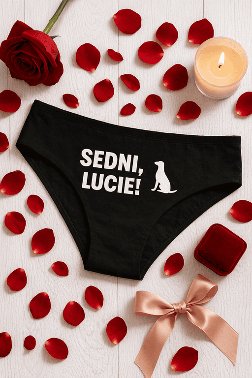 🐾 Nápis „Sedni, Lucie!“ a silueta pejska říkají všechno: tady velíš ty. Černé dámské kalhotky s bílým potiskem jsou drzé tak akorát – aby pobavily, ale pořád zůstaly nositelné na každý den. 😄