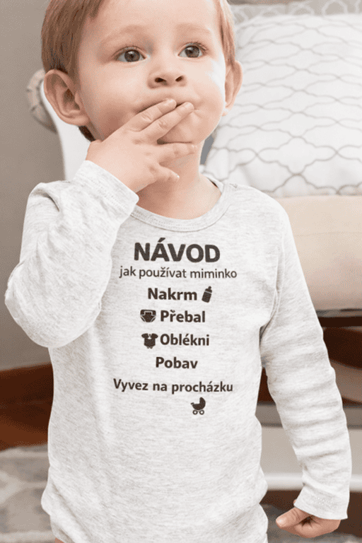 Když rodičovství nemá manuál… tak ho aspoň nosíte na bodýčku 😄 Nápis „Návod jak používat miminko: nakrm, přebal, oblékni, pobav, vyvez na procházku“ rozesměje každou návštěvu 👶🍼