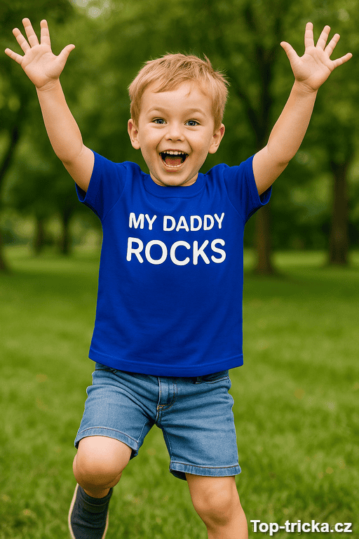 Dětské tričko my daddy rocks říká nahlas to, co si doma všichni myslí: táta je prostě rocková hvězda. Ideální na rodinné fotky, oslavy a chvíle, kdy chcete tátu trochu pošťouchnout 😄.