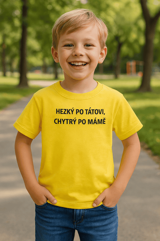 Genetika v nejlepší formě 😄 Dětské tričko s nápisem „Hezký po tátovi, chytrý po mámě“ pobaví rodiče i okolí a malému frajerovi dodá ještě víc sebevědomí.