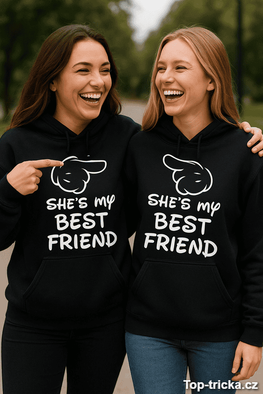 Vtipná mikina best friend, která řekne pravdu za tebe: SHE’S MY BEST FRIEND. Ideální pro duo, co má společné historky, kterým nikdo jiný nevěří 😄