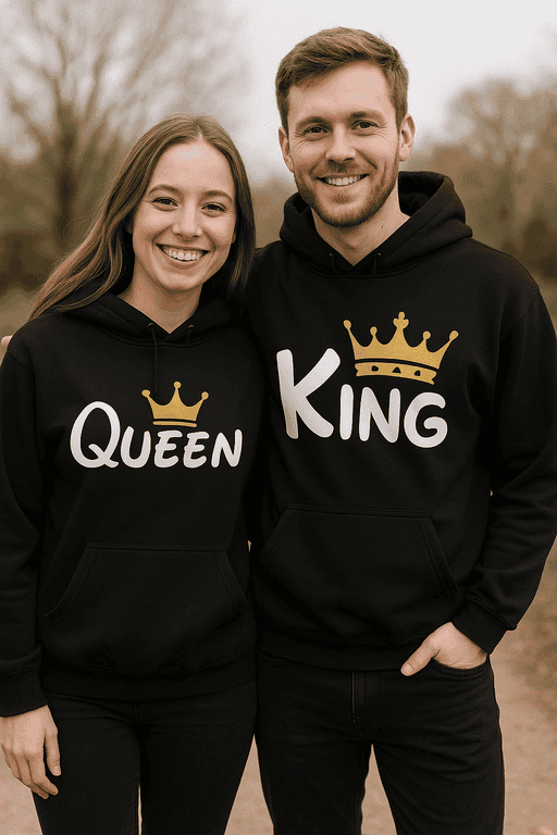 Tahle vtipná mikina v páru je jako malý královský dekret: jeden je KING, druhý QUEEN – a hotovo. Hodí se na domácí pohodu i do města, když chcete být sehraní, ale pořád vtipní. Navíc udělá parádu na fotkách a vyvolá přesně ten typ pozornosti, který chcete: „Kde jste to sehnali?“