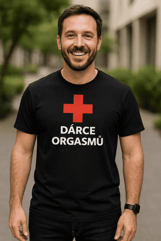 🚑 Nouzový stav dobré nálady? Žádný problém — Dárce orgasmů je připraven zasáhnout. 😄 Černé tričko s výrazným červeným křížem a bílým nápisem má přesně tu drzou energii, která rozjede každou párty během pár vteřin.