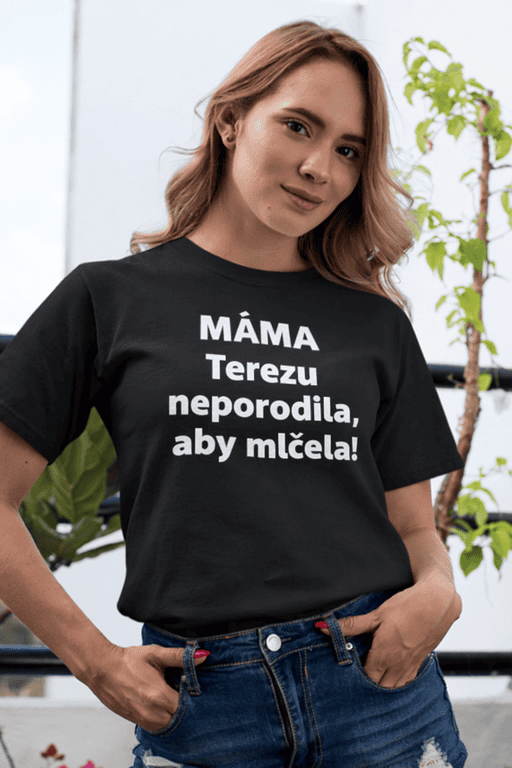 Černé bavlněné tričko s bílým potiskem a hláškou, která mluví za všechno: „Máma Terezu neporodila, aby mlčela!“ 😄