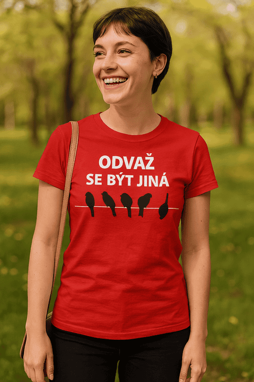 Pět ptáčků na drátu a jeden to bere po svém – stejně jako ty. 🐦 Červené tričko s nápisem „Odvaž se být jiná“ pro holky, které se nebojí vyčnívat. 😄