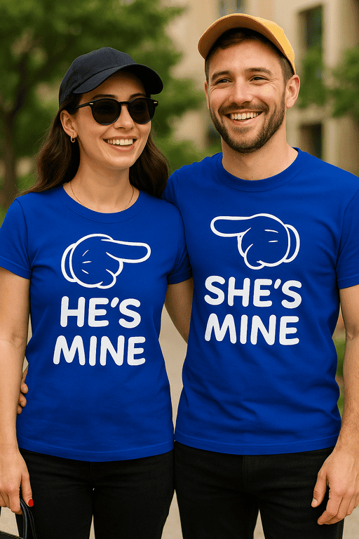 Set dvou modrých triček s potiskem HE’S MINE a SHE’S MINE je přesně pro dvojice, které se umí brát s nadhledem. Skvěle vypadá ve dvojici, pobaví na ulici a na fotkách funguje jako instantní „my“ moment. Pokud hledáte vtipné tričko pro páry, které je jednoduché, výrazné a bez trapnosti, právě jste ho našli.