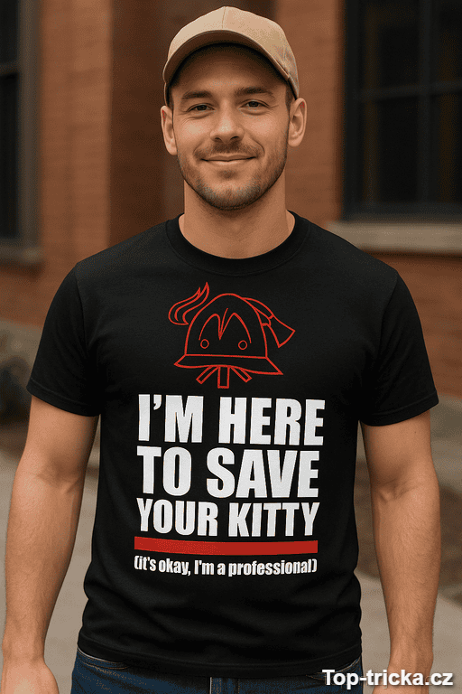 Vtipné tričko save your kitty je přesně ten typ humoru, který začne nevinně a skončí salvou smíchu. Nápis „I’M HERE TO SAVE YOUR KITTY (it’s okay, I’m a professional!)“ je drzý tak akorát – aby to bylo vtipné, ne trapné. 😏