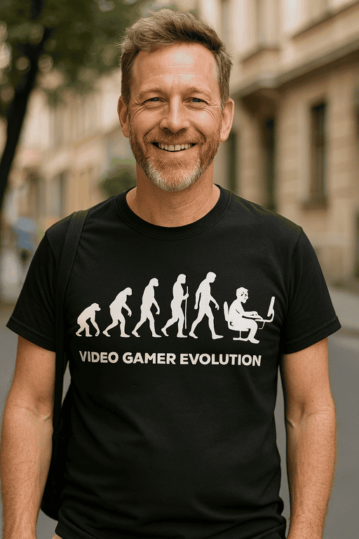 Kde končí evoluce člověka? 🎮 U monitoru s myší v ruce! Vtipné tričko VIDEO GAMER EVOLUTION pobaví každého hráče a ukáže, že „progress“ je životní styl. Skvělý dárek na turnaj, stream i běžné nošení 😄