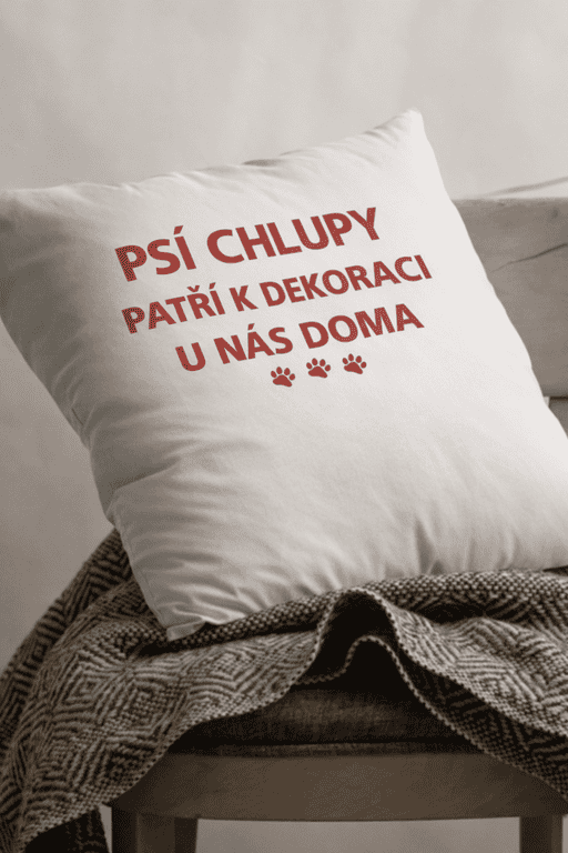 Když pes rozhoduje o interiéru 🐾 Bílý polštář s nápisem „Psí chlupy patří k dekoraci u nás doma“ pobaví a omluví každou chlupatou stopu. Ideální pro všechny psí rodiče.