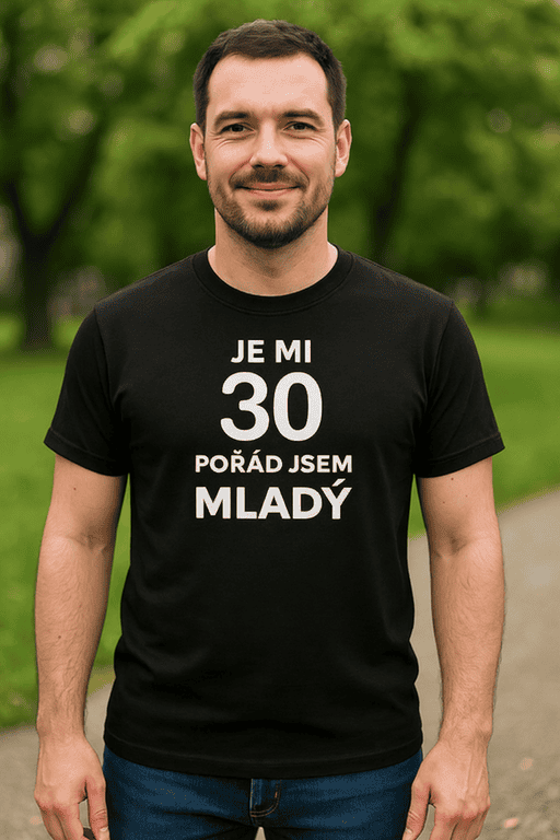 Věk? Jen číslo. Styl? Na plný pecky 😎 Tohle černé tričko s bílým nápisem „JE MI 30 / POŘÁD JSEM MLADÝ“ je přesně pro ty, kteří se nenechají rozhodit svíčkama na dortu.