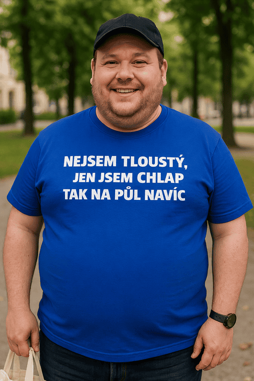 Modré tričko, které řekne pravdu dřív než váha. 😎 Nápis „NEJSEM TLOUSTÝ, JEN JSEM CHLAP TAK NA PŮL NAVÍC“ rozesměje partu a přidá sebevědomí. 💙
