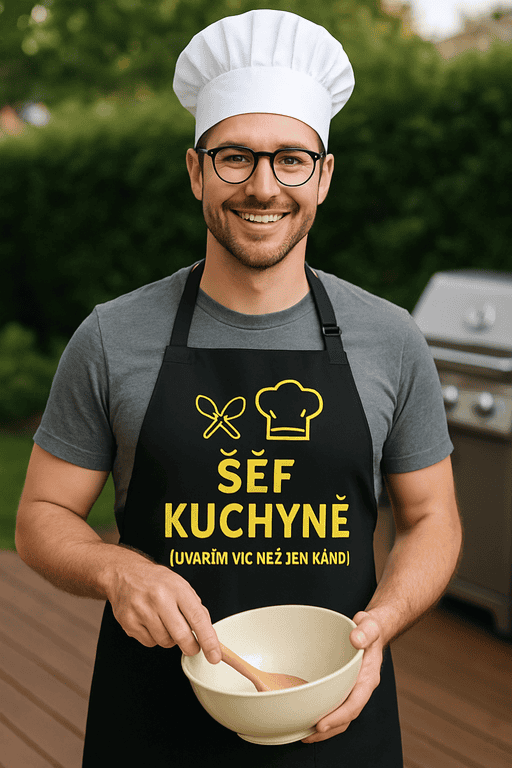 Zástěra „Vtipná šéfkuchař“ – Ideální pro kuchaře, kteří nejen rádi vaří, ale také baví své okolí! Ukažte světu, že smích je tajnou ingrediencí každého pokrmu. Perfektní dárek pro každého, kdo se nebojí v kuchyni trochu zašpásovat!
